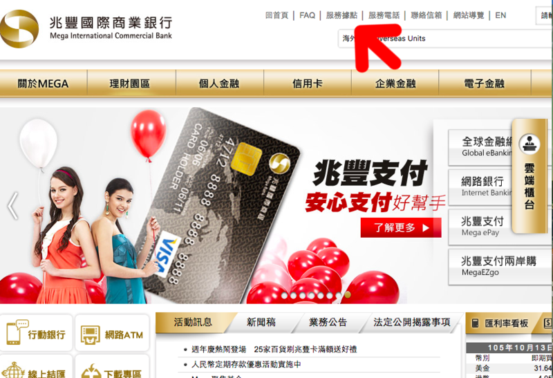 Step1:進入兆豐銀行官網,找到右上角的「服務據點」。