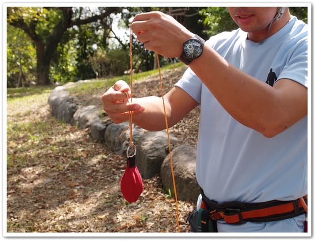 利用投擲繩跟這條紅色的豆袋,把爬樹繩送到樹上。