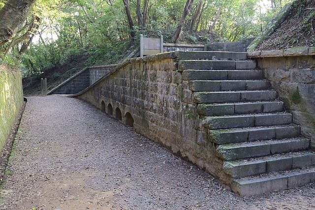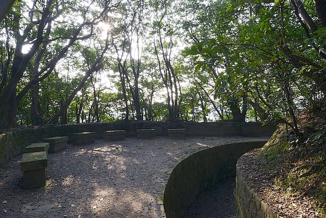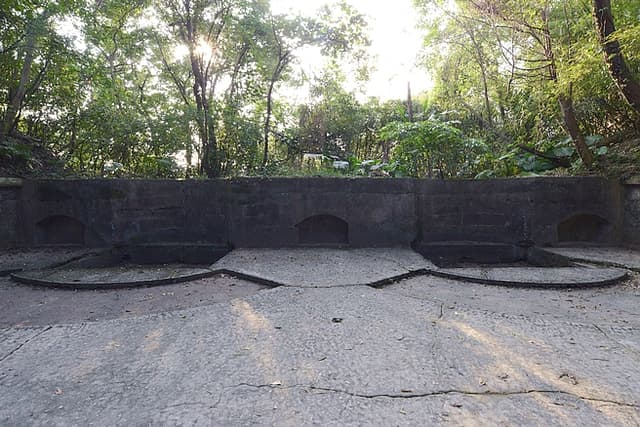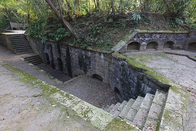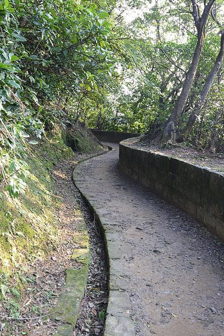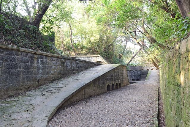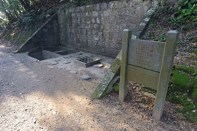 順著空地旁的外垣行走,一路上可見蓄水池及避彈壕等設施的結構都還相當完整,而設施旁長滿青苔的石造解說牌更是毫無違合感的融入古蹟風景之中。