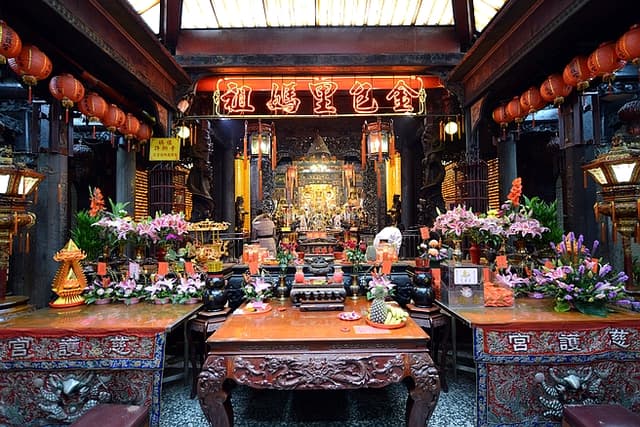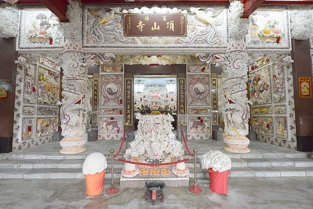 這間廟宇,最具特色的便是他獨特的裝飾,廟口不同於常見的石獅,而是用貝殼及珊瑚所組成,有著龍頭魚身的鰲魚。而整間廟宇,不論是墻面、天花板還是香爐都以貝殼及珊瑚做了綴飾,繽紛而莊嚴雅致。廟中更有小型隧道,身在其中,被滿佈的珊瑚包圍,有如置身東海龍宮之錯覺!