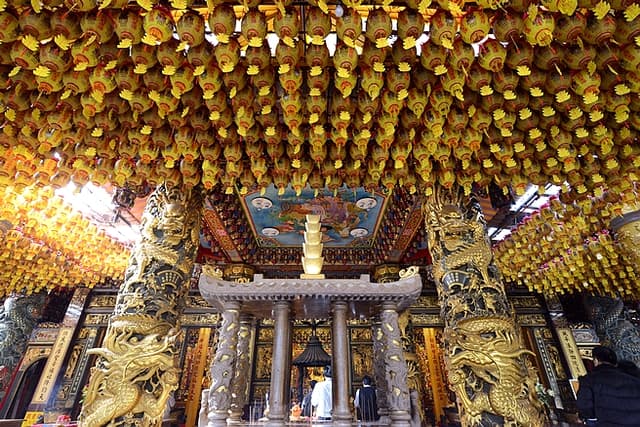 與一般寺廟常見的圓形龍柱略有不同,盤旋於八角柱上的龍,充滿了立體感的雕刻方式看起來栩栩如生;而據傳越摸越發財的古老龍柱,更是有不少地方被信徒摸的發亮。