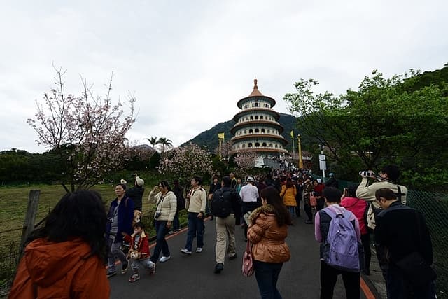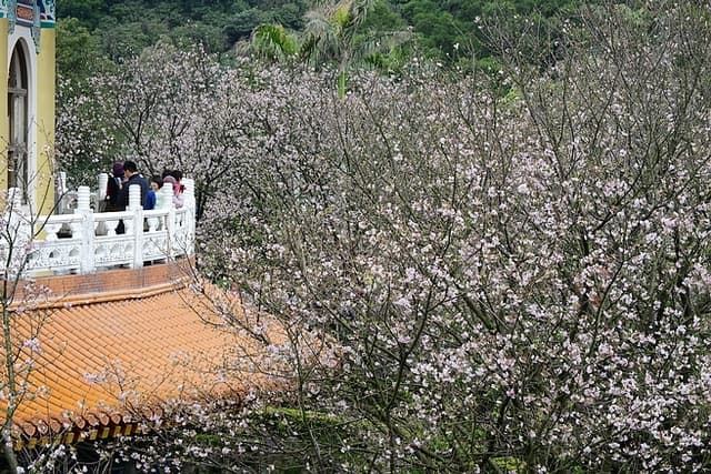 無極天元宮的櫻花分為多區,2 月為後山「三色櫻」開花,三月為正殿等的「吉野櫻」開花。