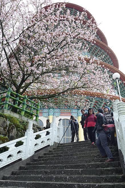 爬上長長的階梯來到天壇前面,雖然與櫻花=和風的既有概念相異,不過兩旁盛開的櫻花襯上高聳天壇所形成的美麗畫面仍舊讓人贊嘆不已。