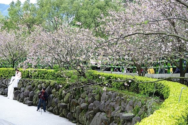 離開天壇沿著一旁的環狀道路漫步,沿著道路種植的櫻花樹讓整個步道染上了淡淡的粉紅色。