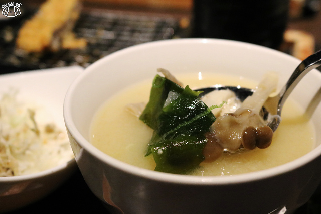 九州鹿兒島直輸,大里肌部位,肉質保水性高,纖維細緻無腥味,口感更勝一般黑豚。曬得烏漆媽黑的豬排,切面就很明顯看到油脂,跟丹麥豬相比,單吃就有一股很濃郁的豬肉味道,肉質比較彈,加上油脂多,我蠻喜歡的!外層黑色麵衣吃起來口感則跟一般的一樣,也沒特殊味道,配料比我的元氣套餐多了小小的海老跟玉子燒。飯是使用台灣在地栽種的越光米,粒粒分明有彈性。