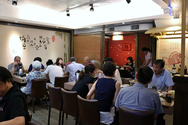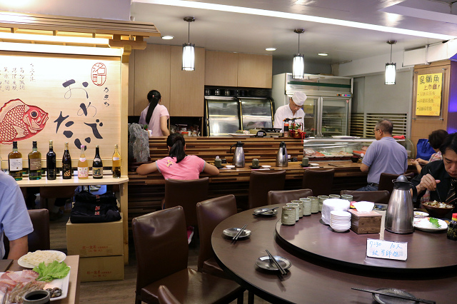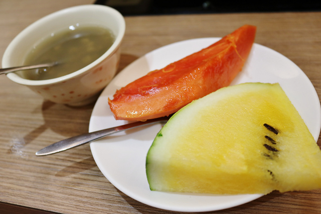 餐後有水果和綠豆湯,餐點蠻平價又新鮮,整個晚上都沒有空桌過,幾乎全是常客,隔壁桌是來慶生的,居然端出了一盤炙燒鮭魚捲成花,插上蠟燭當成生日蛋糕送上,真是超有趣的XDD