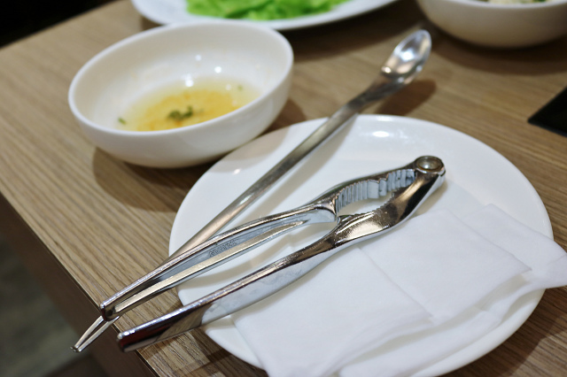 正擔心不知道要怎麼解決這隻花蟹時,就送上了吃螃蟹的工具以及濕紙巾給我們。