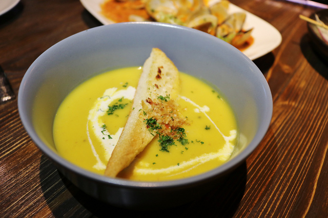 南瓜湯跟前菜相比稍嫌遜色些,附了一塊麵包,奶味偏濃,但不屬於濃郁的南瓜湯。