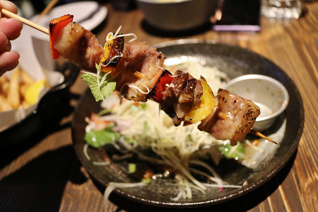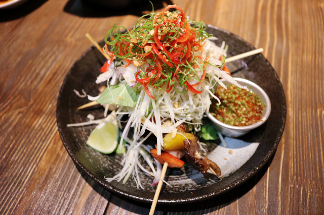 Waiting Bistro 不只義式料理美味,連泰式等南洋風味都很道地,青木瓜絲切得細細的,肉串的油花偏多些,彩椒配色鮮艷,整體很清爽很有特色,尤其是那醬料一淋下去,酸甜風味更上一層!