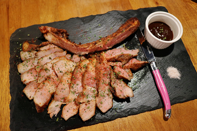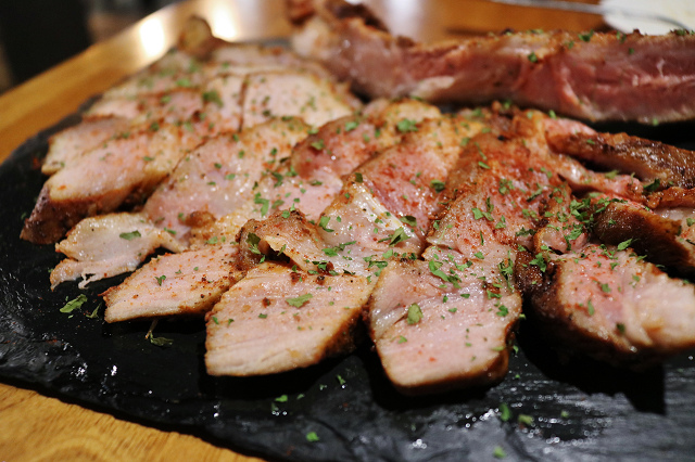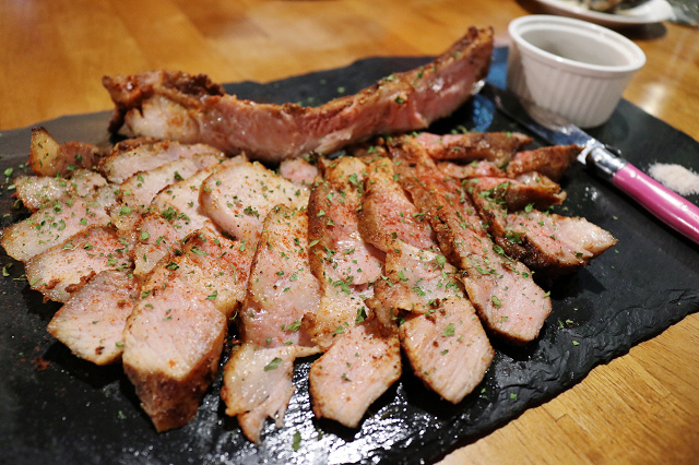 一訪Mastro Cafe時吃到戰斧豬排念念不忘,二訪毫不猶豫的又點了它。戰斧豬排上桌前,店員先過來詢問是否直接幫我們切好,想到上回被我們切的亂七八糟XD. 有人幫忙切好似乎不錯,先切好是真的很方便食用,但缺點是肉會冷的比較快,後來灑上的香料有點灑太多,口味上稍微鹹了一點,跟上次的戰斧豬排比較,這隻豬比較肥一點,肉質嫩而多汁,豬排醬一樣非常好吃!!