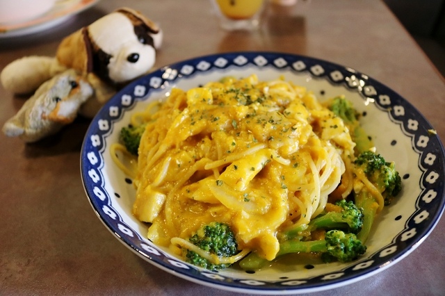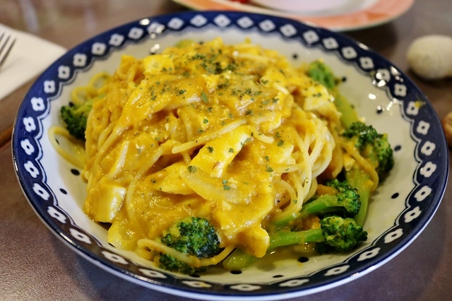 濃濃的金黃南瓜醬,配上鹹蛋到底會是甚麼滋味?!鹹蛋不會太鹹,鹹香鹹香點綴,還有切丁的多汁杏鮑菇,我們一吃都好喜歡好喜歡,味道真的很好,好吃到我一直有衝動想要再點一盤呀!!
