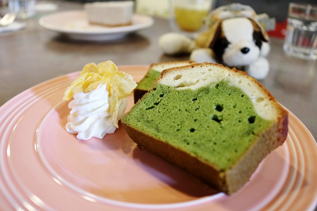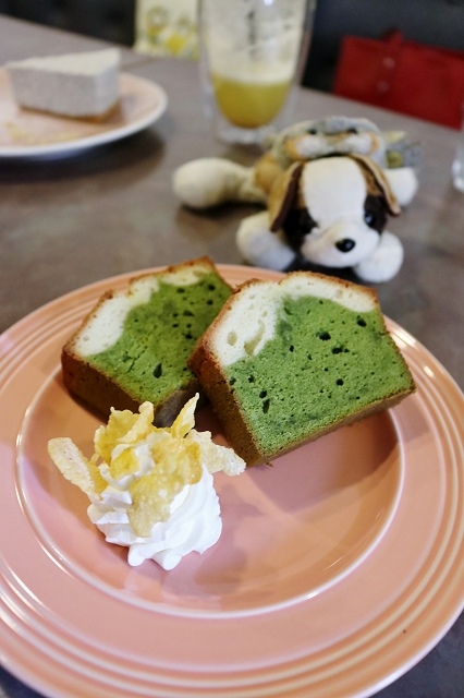 由你咖啡每天都會出爐不同口味的磅蛋糕,當天有莓果跟抹茶兩種,聽到是雙色抹茶立馬欽點,才一百元居然上了兩大塊磅蛋糕,害我嚇了一跳!!磅蛋糕真的非常優秀,烤得酥酥綿綿的,熱呼呼的好吃的不得了,而且一點都不會過甜,大推特推>///<.