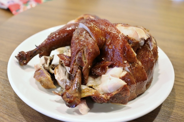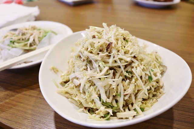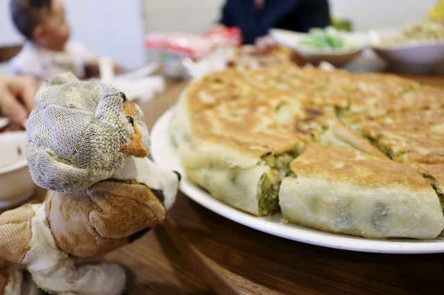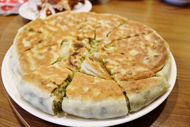 據說用了三斤的麵粉和三斤的三星蔥製做,外皮煎得酥酥脆脆的,不過內餡是軟軟的,說實話我覺得不像是蔥油餅,像是外層煎得酥酥的麵糰XD