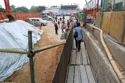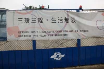 我們穿越了三環三線工程地,仔細看著沒有鋪上柏油的工地路上,泥水混雜,這明明是平常一般人不會走的路,道路兩旁卻掛滿了許多標語「三環三線,生活無限」、「三環三線,繽紛你我生活」,甚至是「捷運環狀線,連結你的幸福」,我突然想到在過去那個高壓的白色恐怖時期,到處也掛著「反攻大陸,解放同胞」的樣子,總覺得有異曲同工之妙。