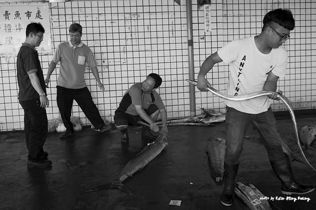 當現場幾乎所有人都將雙手背在身後,專注於眼前的競價時,只有我舉起相機默默地隱身在人群裏頭,快速穿梭其中。魚市裡的「喊價」成了一種樂趣,端詳著人群臉上那些隱藏著勝利、扼腕、無奈、旁觀興味的各種笑容、各種角色,透過鏡頭,我得以自在地遊走於灰階的世界裏頭,黑白照片裡的階調層次與反差感,如生活一樣細膩且真實,且充滿了直覺。