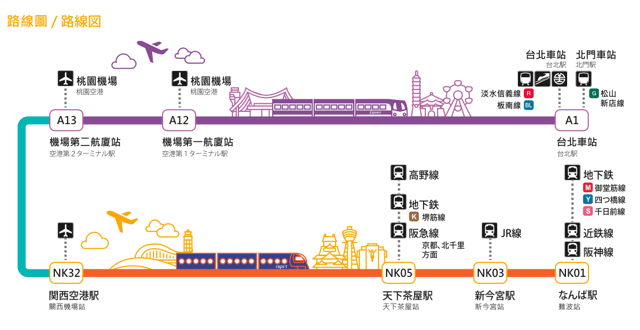 - 適合誰用:從台北車站出發、從桃機飛到關西機場、搭車到難波站的人(從難波的前兩站天下茶屋可轉車前往京都),或是從難波出發要從關西機場飛回桃園機場,回到台北車站的人。