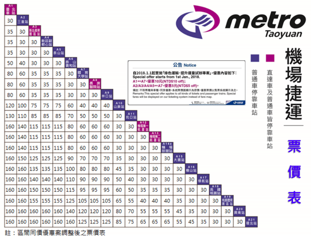 ▲桃園機場捷運票價表,從台北車站搭直達車道桃園機場大概是 35 分鐘。