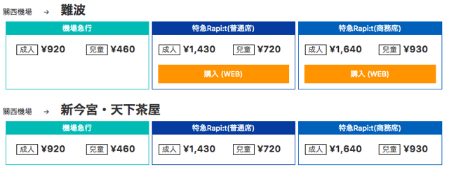 ▲機場特快 Rapi:t 票價表,從關西機場搭特急 Rapi:t 到難波大約是 34 分鐘。