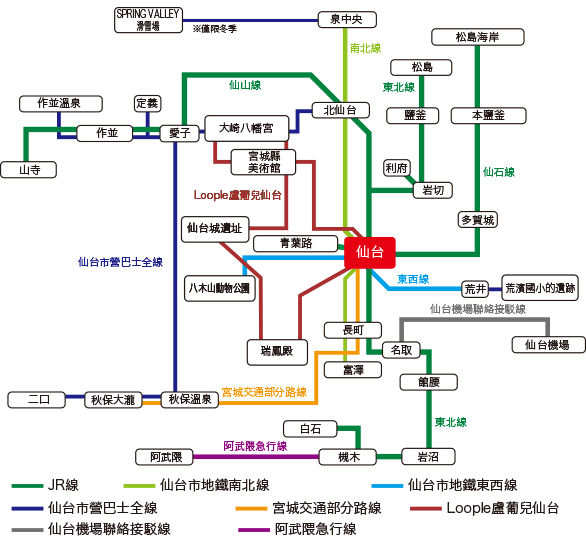 先給大家參考一下仙台觀光巴士的路線圖,仙台市區內的熱門景點都在裡面了: