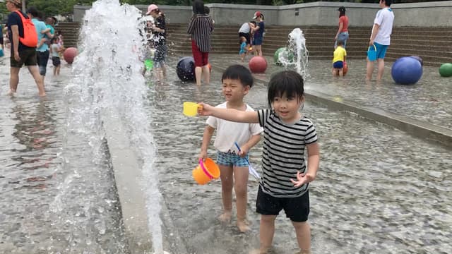 戶外的戲水池及沙坑區是夏天(6~10月)限定,只要入館即可免費使用不須再額外付費,有的遊客會帶野餐墊及小帳篷來,就會有種來到海邊野餐玩水玩沙的錯覺。