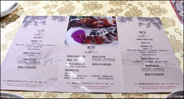給大家參考一下菜單,櫻桃鴨三吃適合四人分享,六道菜(櫻桃鴨三吃)加甜點,2588加一成;