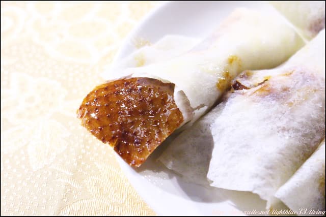 以特製的捲餅皮,搭配宜蘭在地三星蔥及五星主廚特製的醬料,特別能品嚐到鴨的原味