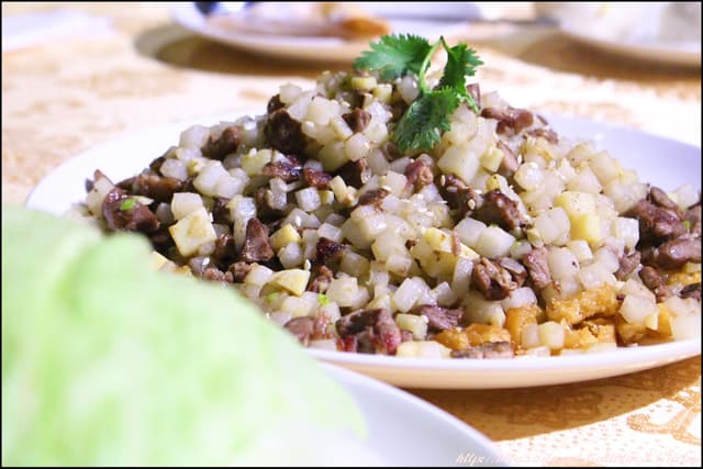 鴨肉切成大丁後加荸薺一同拌炒,吃得到鴨肉的口感和濃濃鴨味,是老少咸宜的吃法