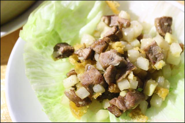 一般都是生菜包蝦鬆,因為是烤鴨五吃,所以才能吃到這道菜呢,