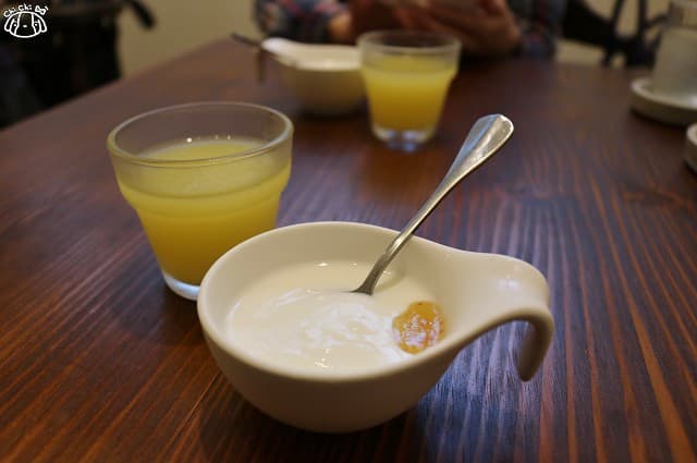 套餐餐前有蜂蜜桔汁、自製優格、本週例湯、季節沙拉、餐後甜點及飲料,