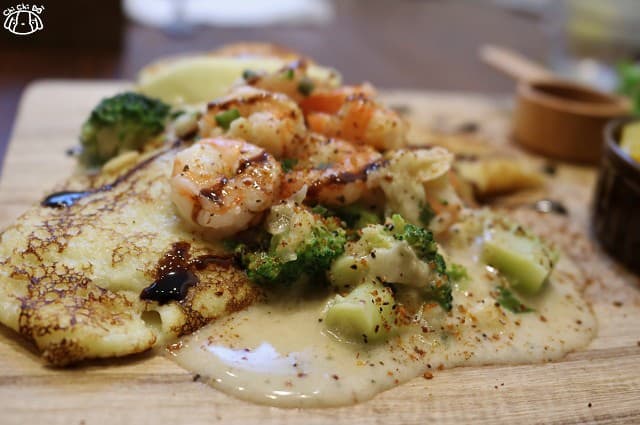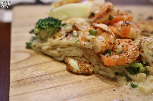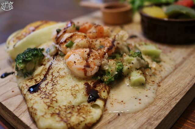 可麗餅本身微甜,上頭的醬汁帶乳酪香濃郁,