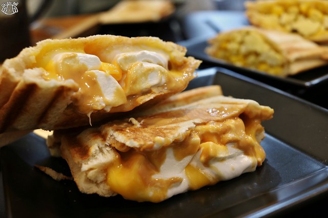 裏頭的花生醬不是一般的花生醬而已,滿滿花生顆粒好香濃,棉花糖像慕斯軟綿綿,又像起司牽絲牽好長,半融半化的起司黃澄澄的猛一看還以為是蛋黃呢~