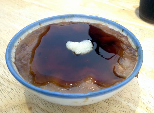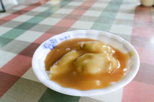 清蒸的比用油炸的肉圓清爽了點,但我覺得桌上的調味料,芥末醬實在太搶眼,好餓呀。