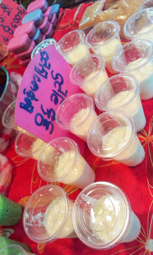 走著又看到其中一攤上擺的非台灣物,便吸附過去搭訕緬甸老闆娘,並且買一杯要價五十元的常溫酸奶做為吸附手段。