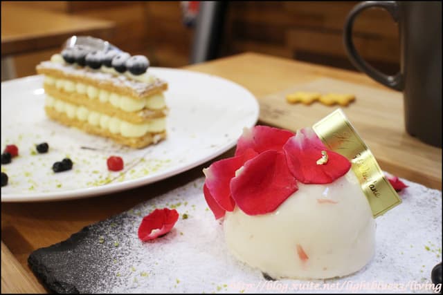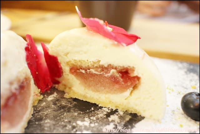 這是因為我太早到而還沒被放到甜點櫃裡頭的玫瑰荔枝慕斯,不過詢問之後得知已經在廚房做最後妝點,所以我就很開心地不管飲料已經選了玫瑰牛奶還是硬要吃,但是真的很美啊,光是造型就值得了!