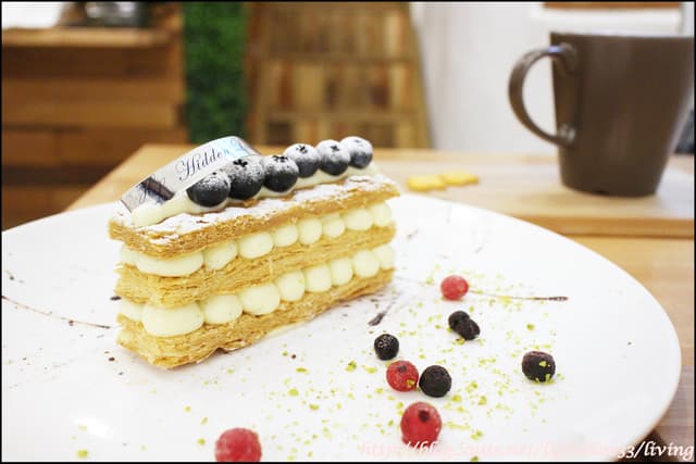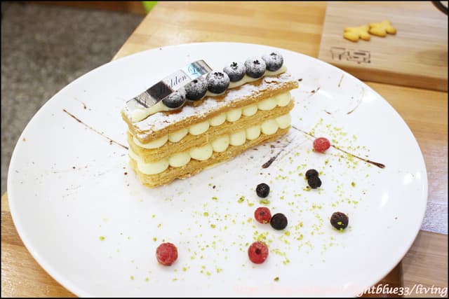 店家使用馬達加斯加香草莢,所以能夠看到卡式達醬上頭有不手軟的滿滿香草黑點,吃起來也是僅有淡淡的自然甜味,吃起來黏稠度很實在但是不膩口,千層則是酥鬆清爽,一口咬下的層層酥脆非常令人滿意,藍莓更是每一顆都好甜,我在別人食記中看到草莓季的千層莓果森林版本非常厲害,好希望草莓季時我還可以再來吃一次啊!