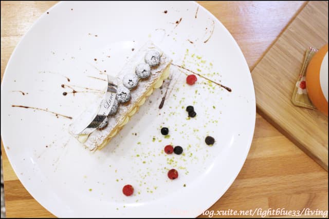 說實在,千層派一上桌的時候我有點小失望,因為並不是很大一個,而且只有簡單的藍莓跟千層搭配而已,可是當我切開吃下第一口之後我就完全心服口服,因為真的很好吃!