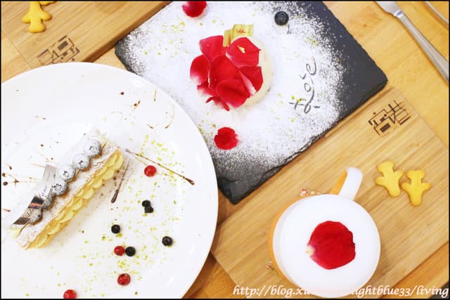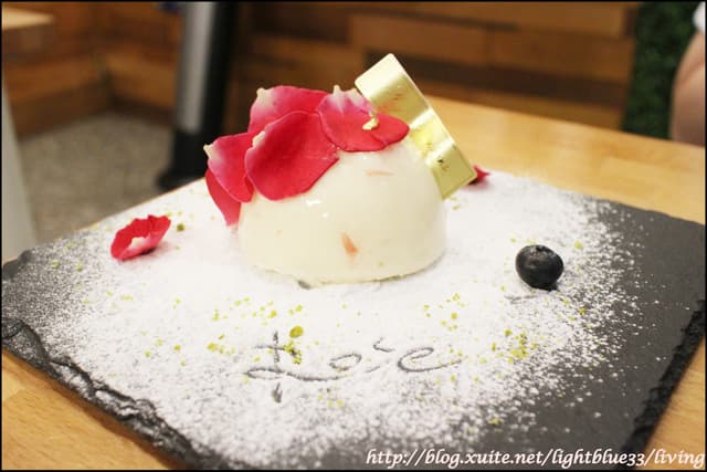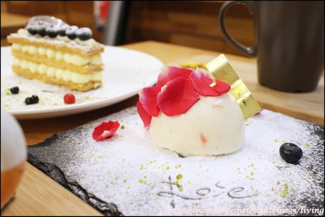 玫瑰荔枝慕斯用了大量的玫瑰花瓣裝飾,而且還在盤子上的糖粉上畫出了Rose的字樣,跟我的玫瑰牛奶相互呼應:)