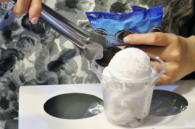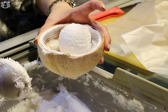 會先把椰子殼裡的椰仁挖出來,把椰仁鋪在冰底下,再挖三球的椰子冰淇淋,依口味去加料,我的6號加了Oreo,再淋上焦糖醬,而且是加迷你版的Oreo,看店家是使用小包裝,現場才打開,我很討厭吃到潮濕軟掉的餅乾,這點還蠻讓我開心的!