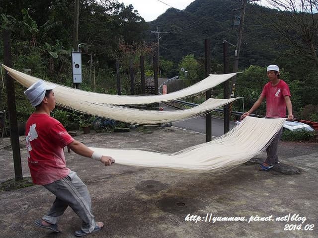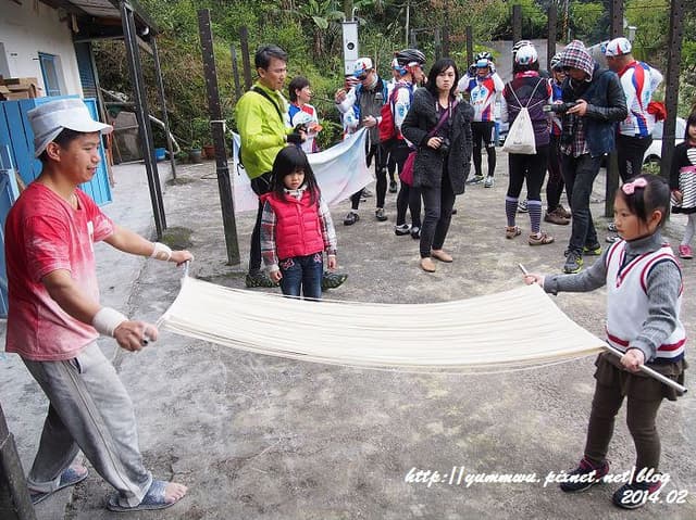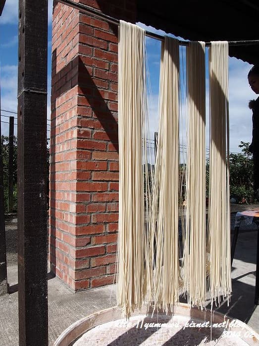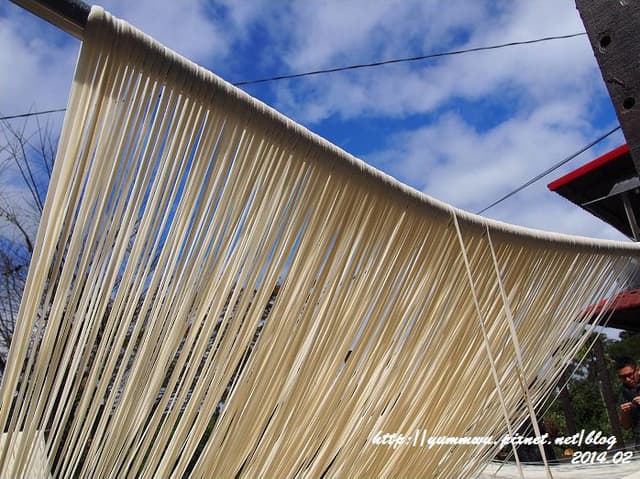 山上的天氣總是陰晴不定,在吃麵的時候下著傾盆大雨,不一會兒又是藍天白雲,師傅趕緊拿出麵線到院子曬,這曬麵的景象真的美到不像話啊!