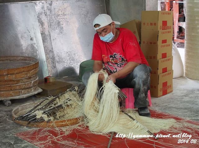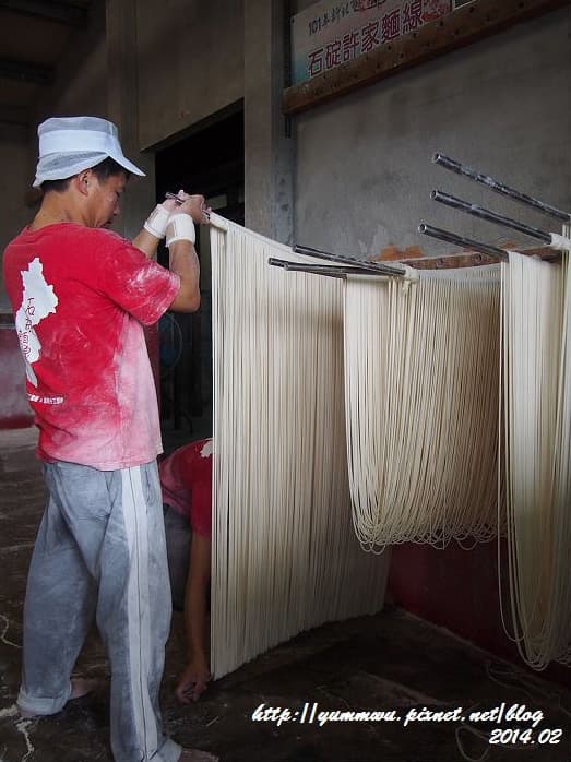 許老闆親自來向我們介紹麵線的製作過程,他說:傳統的手工麵線吃起來有自然的 Q 彈口感,這是來自於繁複的製作流程,需壓、搓、揉、捏、擠、拉、甩七步驟且歷經七小時,而且每個步驟都無法精簡,對他來說這項傳統的製程與曬麵線的景象,本身就是一幅美麗的技藝畫面。