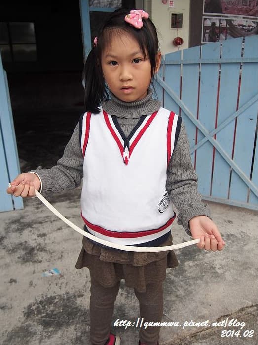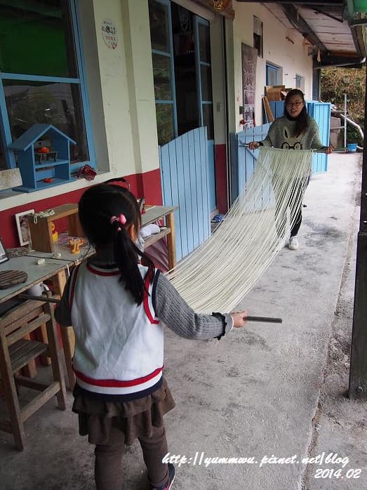 拉麵線其實要一股"巧勁"…. 拉、甩、扯、拖、彈,才能把麵線拉得又長又直,蓁蓁一開始好緊張哇!不過熟悉了步調後,也逐漸抓到要領 ….