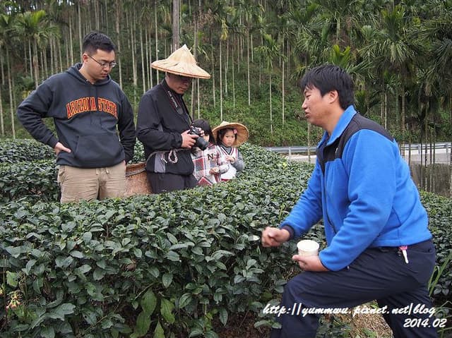 曾大哥帶我們到他的茶園體驗採茶,他說石碇出產的茶葉叫做東方美人茶或是香檳烏龍,會挑選被小綠葉蟬咬過的嫩芽,經過人工採摘再製成茶葉。