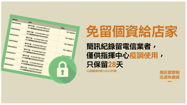關於個人資料也不用擔心,店家不會留有資料,簡訊紀錄只會留給電信業者,直接給指揮中心疫調使用,且只保存 28 天。