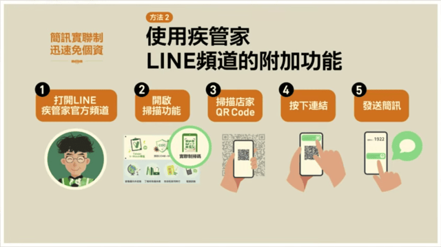 二、透過 LINE「疾管家」點擊「實聯制掃碼」按鈕,接著掃描店家提供的 QR code,再按下連結、發送簡訊即可。