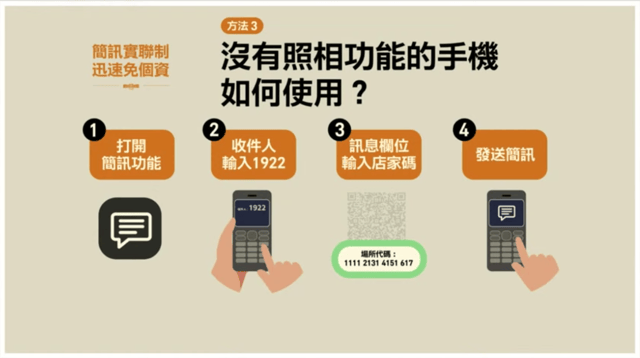 三、若是沒有相機功能的手機,透過簡訊收件人填寫 1922,並輸入 QR code 底下的場所代碼,發送簡訊即可。