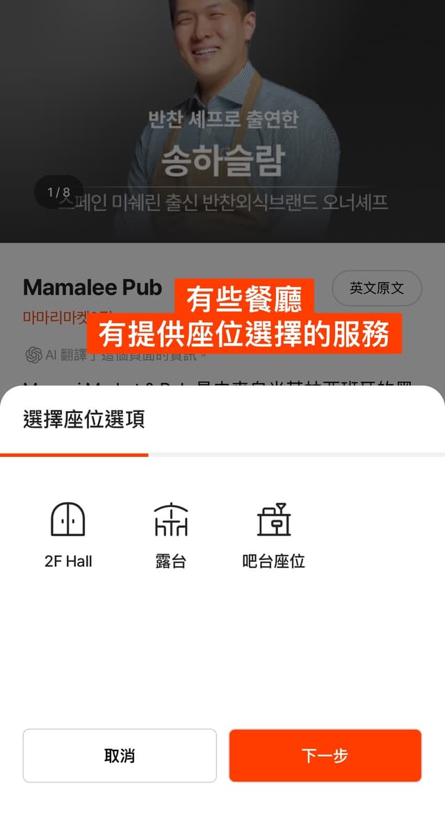 確認要預約後,你會發現有些餐廳可以選擇用餐區域,或者有提供外帶服務。