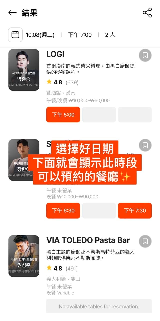 需求選擇好後系統就會列出可以預約的餐廳啦,非常的直覺好上手呢。