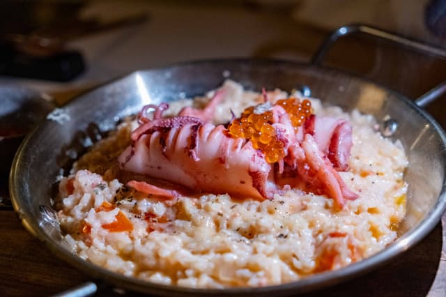 給你滿滿的海味!海釣透抽上鋪滿鮭魚卵,因為新鮮所以嫩脆彈牙,加入明太子的燉飯使用泰國皇家香米,撒上帕馬森起司濃郁加倍,隨餐附上的十三香辣椒粉可依個人喜好加入,撒上後讓這道異國風情的燉飯頓時增添了滿滿的台味,辣香下飯,超級親切!