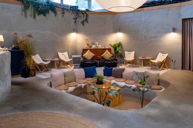 不得不說小雨林私人隱蔽性都很高,我們入住的閣樓樹屋藏身在看不出來是入口的竹製圍欄裡,看似不起眼其實裡頭別有洞天!一進門迎接我們的是和接待大廳同款的下沉式客廳,已經點上的蚊香、開好的空調、調整好的投影屏幕及音響設備,這些小細節都可以看得出主理人和管家們的用心;左轉開放式廚房,餐桌上備有迎賓小點心,檯面上除了餅乾泡麵茶包、還有磨好的咖啡粉,最強的是內建精釀啤酒機,25 公升的現拉生啤唾手可得,睡前喝起床喝想喝就喝簡直太幸福。