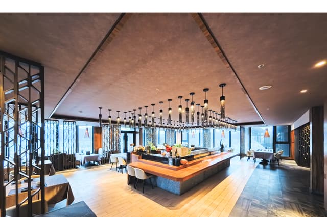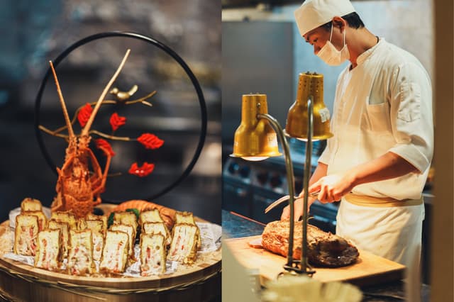 以「森林」為設計靈感的用餐空間,木質屏風如樹影婆娑,搭配 270° 大景落地窗。從前菜鰻魚小品、龍蝦刺身,到主菜一比利豬排,每一道都在食材、烹調與擺盤上細膩雕琢,讓味蕾與視覺一同享受頂級饗宴。 -